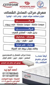 ويقع معرض مراتب الساحل الشمالي في موقع مميز ويعرض أمامه مجموعة كبيرة من المراتب المختلفة، كما هو موضح في الصورة، مع توفير العديد من الأنواع والعلامات التجارية المعروفة.